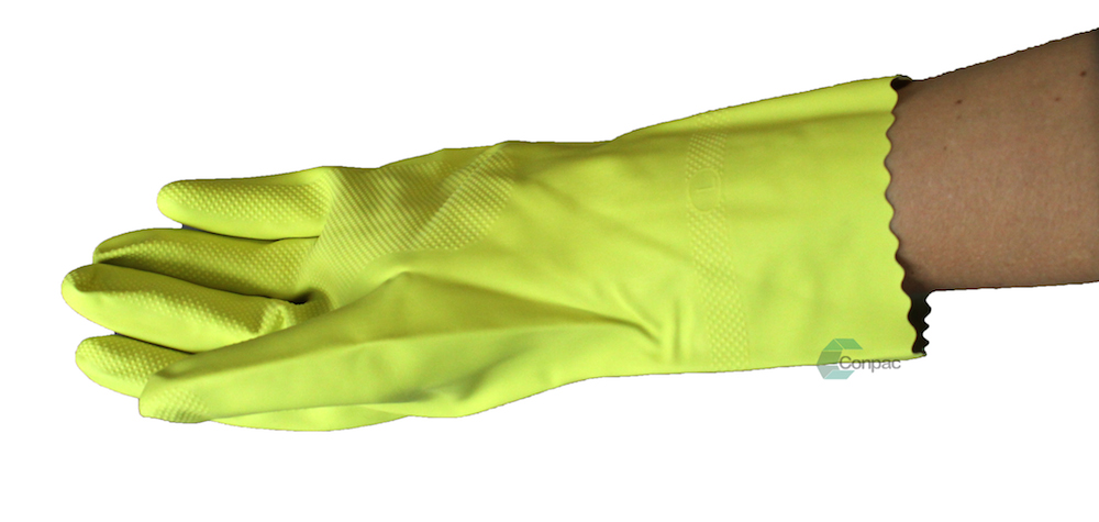 Description Yellow silverlined rubber gloves.