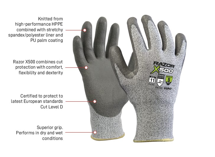 Description RAZOR X500 glove, UHMWPE, cut resistance Level 5, fibre PU coating